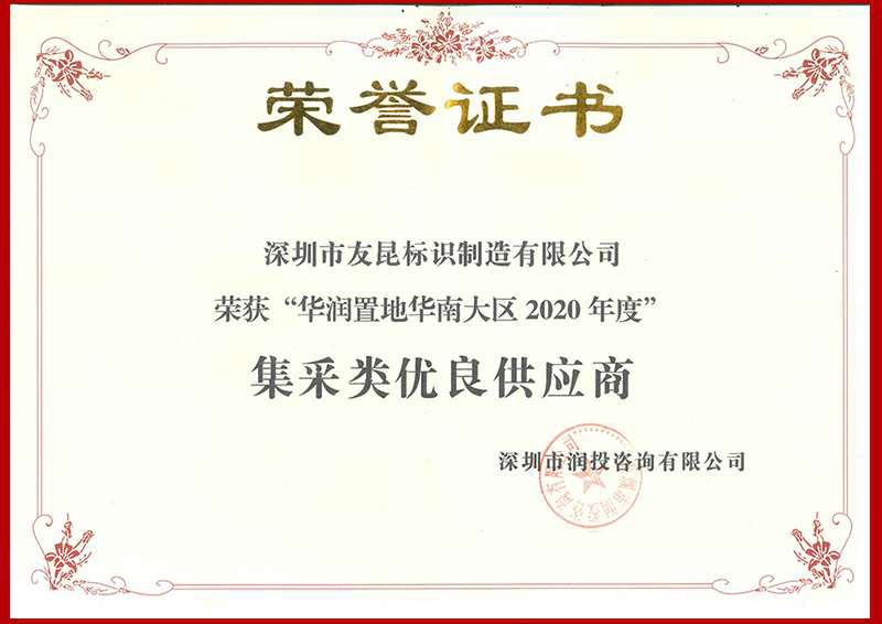 友昆標識-2020年度華潤置地華南大區(qū)集采類優(yōu)良供應商