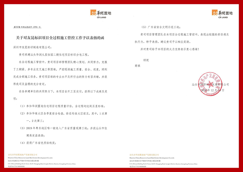 友昆標識-2020年華潤置地表揚信