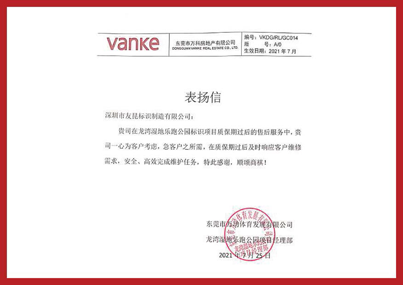友昆標識-2021年萬科表揚信